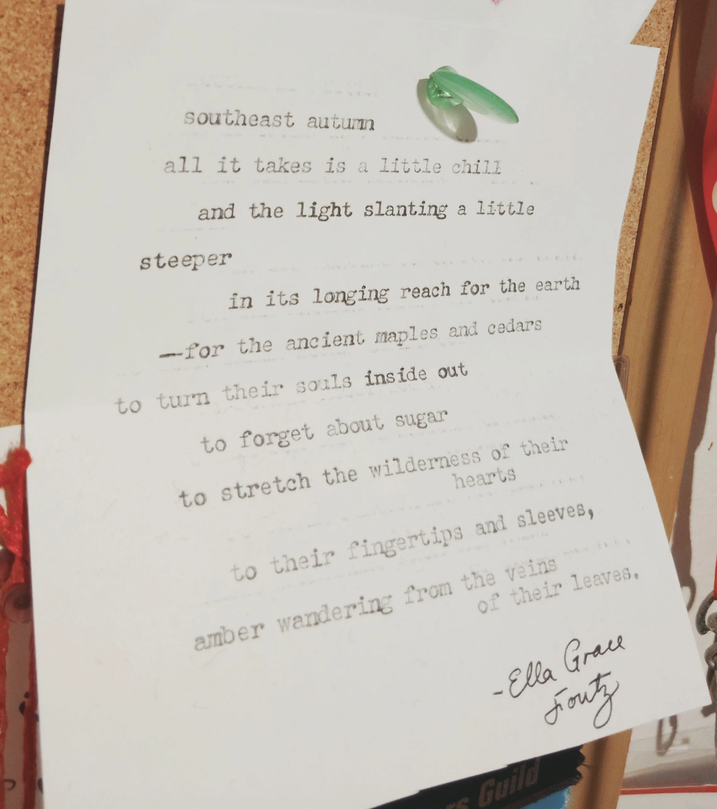 For this market I wanted to try something new. I’d done a book signing a few months earlier at the Leaf & Lore bookshop in Buena Vista, Virginia, along with another author and a poet. The poet, Ella Grace Foutz, had brought an old-fashioned typewriter and was typing out poems for people. I requested one for myself about the changing colors of autumn leaves, and she wrote me this lovely poem, which now holds a place of honor on my writing wall.